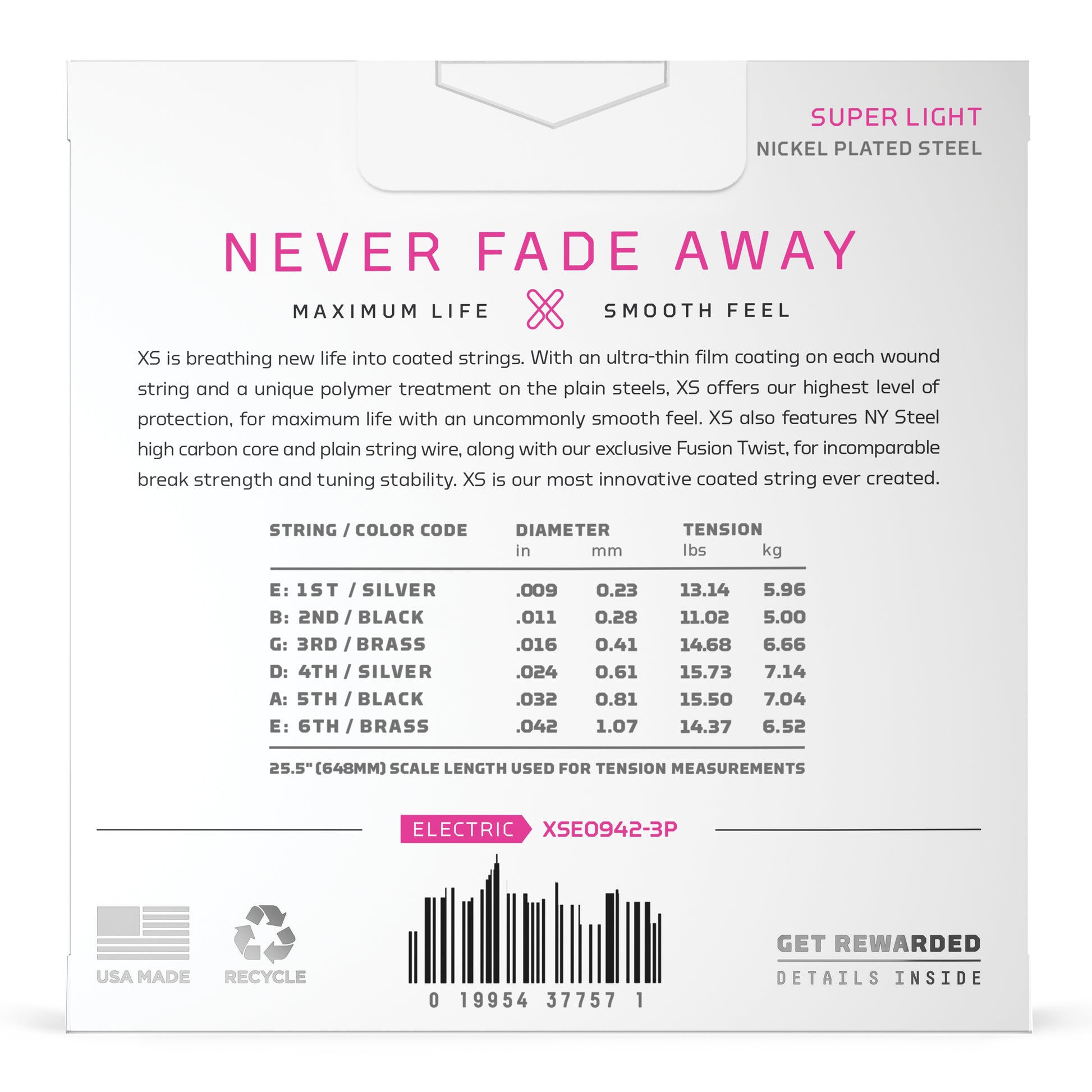 XS is breathing new life into coated strings. With its ultra-thin film coating on every wound string and unique polymer treatment on the plain steels, XS offers our highest level of protection for maximum life with an uncommonly smooth feel. XS also features NY Steel high carbon core and plain string wire, along with our exclusive Fusion Twist, for incomparable break strength and tuning stability. XS is the most innovative coated string ever created.