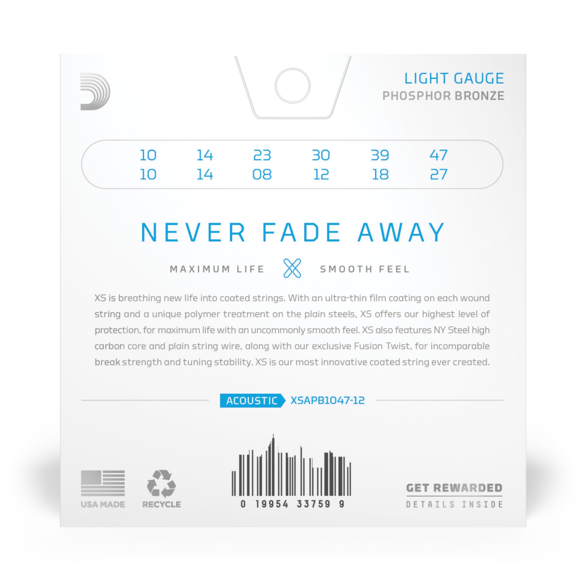 Born from our greatest breakthrough in string innovation, XS Phosphor Bronze strings have the longest life of any D’Addario acoustic guitar string. The XS coating gives our warm, balanced phosphor bronze strings maximum life, with an uncommonly smooth feel. Made with a NY Steel core, phosphor bronze wrap wire and Fusion Twist technology, XS coated acoustic guitar strings have incomparable break strength and tuning stability, in addition to their dramatically increased lifespan. This 10-47 Light gauge 12-string set is great for 12-string acoustic guitars.