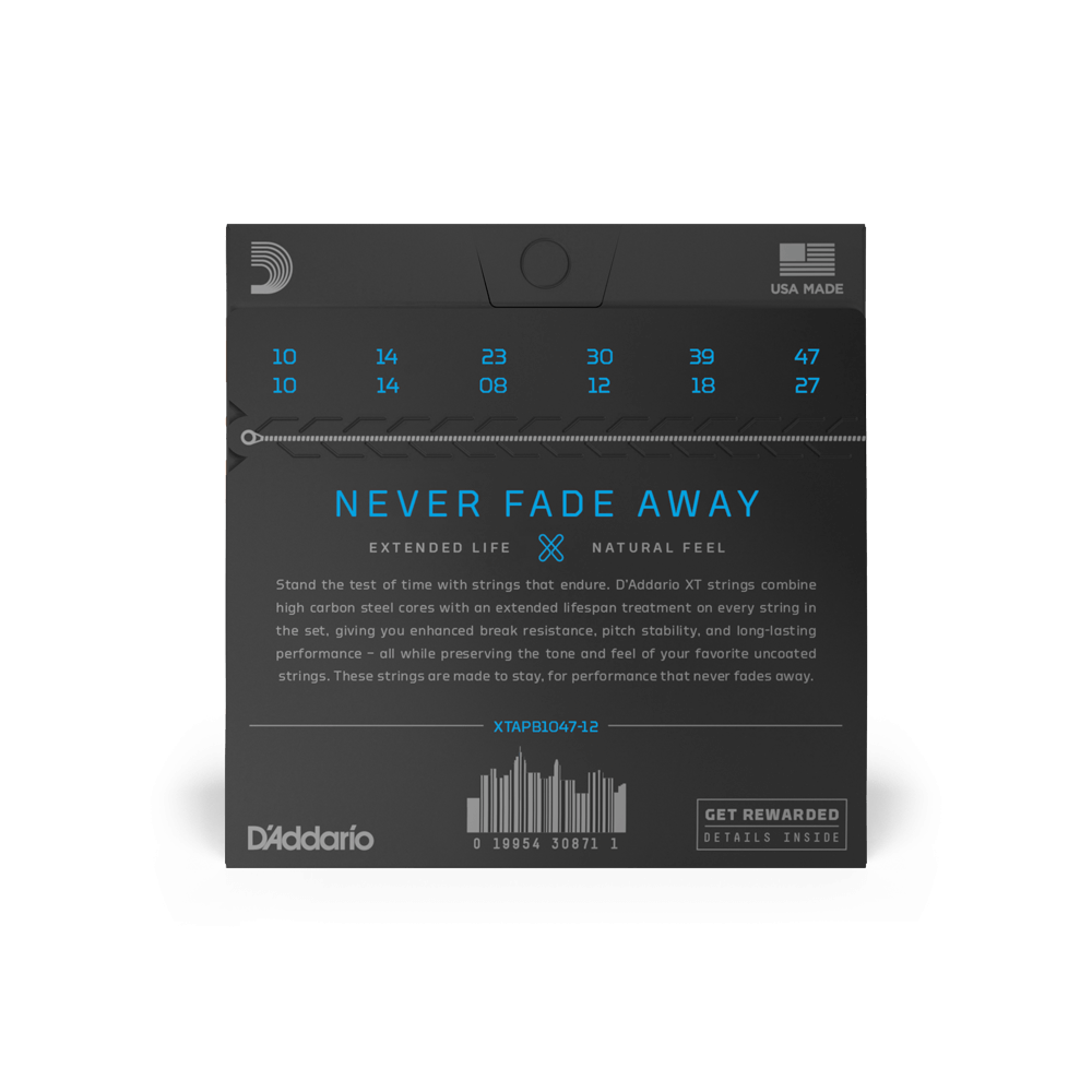 Since D'Addario introduced Phosphor Bronze acoustic guitar strings in 1974, they've been synonymous with warm, well-balanced tone. XT Phosphor Bronze offers that and more, boasting enhanced break resistance, better pitch stability and longer life than our standard phosphor bronze strings. The XT coating delivers advanced corrosion resistance, while still retaining the warm tone and natural feel of the uncoated string. Beneath the coating, these XT acoustic strings are constructed with a NY Steel core, phosphor bronze wrap wire, and Fusion Twist technology, affording tonal versatility with added resilience, excellent for a wide range of acoustic styles. This 10-47 Extra Light gauge set is easy to play and easy to bend.