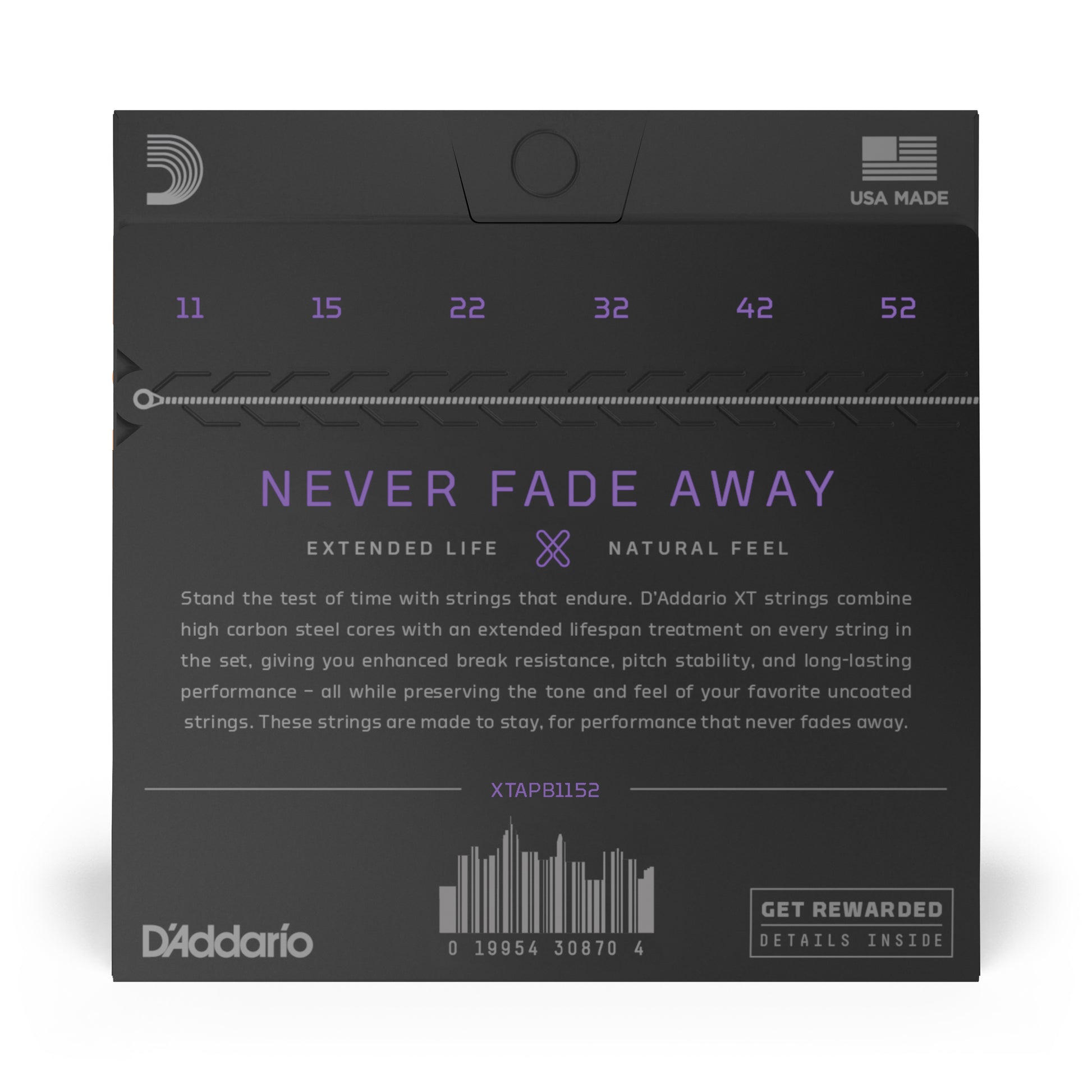 Since D'Addario introduced Phosphor Bronze acoustic guitar strings in 1974, they've been synonymous with warm, well-balanced tone. XT Phosphor Bronze offers that and more, boasting enhanced break resistance, better pitch stability, and longer life than our standard phosphor bronze strings. The XT coating delivers advanced corrosion resistance, while still retaining the warm tone and natural feel of the uncoated string. Beneath the coating, these XT acoustic strings are constructed with a NY Steel core, phosphor bronze wrap wire, and Fusion Twist technology, affording tonal versatility with added resilience, excellent for a wide range of acoustic styles. This 11-52 Custom Light gauge set has slightly more volume and projection than Extra Light, while still being easy to play.